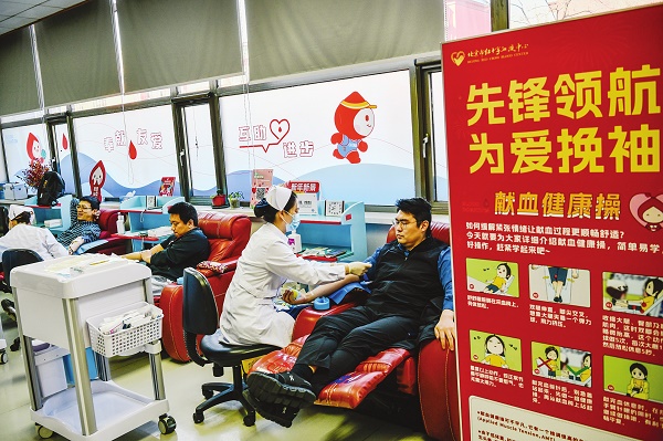 3月20日,北京市红十字血液中心献血大厅,参与活动的人员在献血。